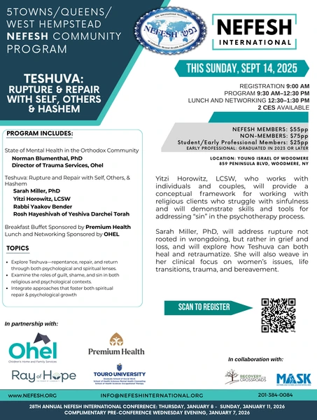 With the Yamim Noraim approaching, the September 14th program offers clinicians an opportunity to reflect on how timeless themes of rupture and repair inform both personal growth and professional practice.